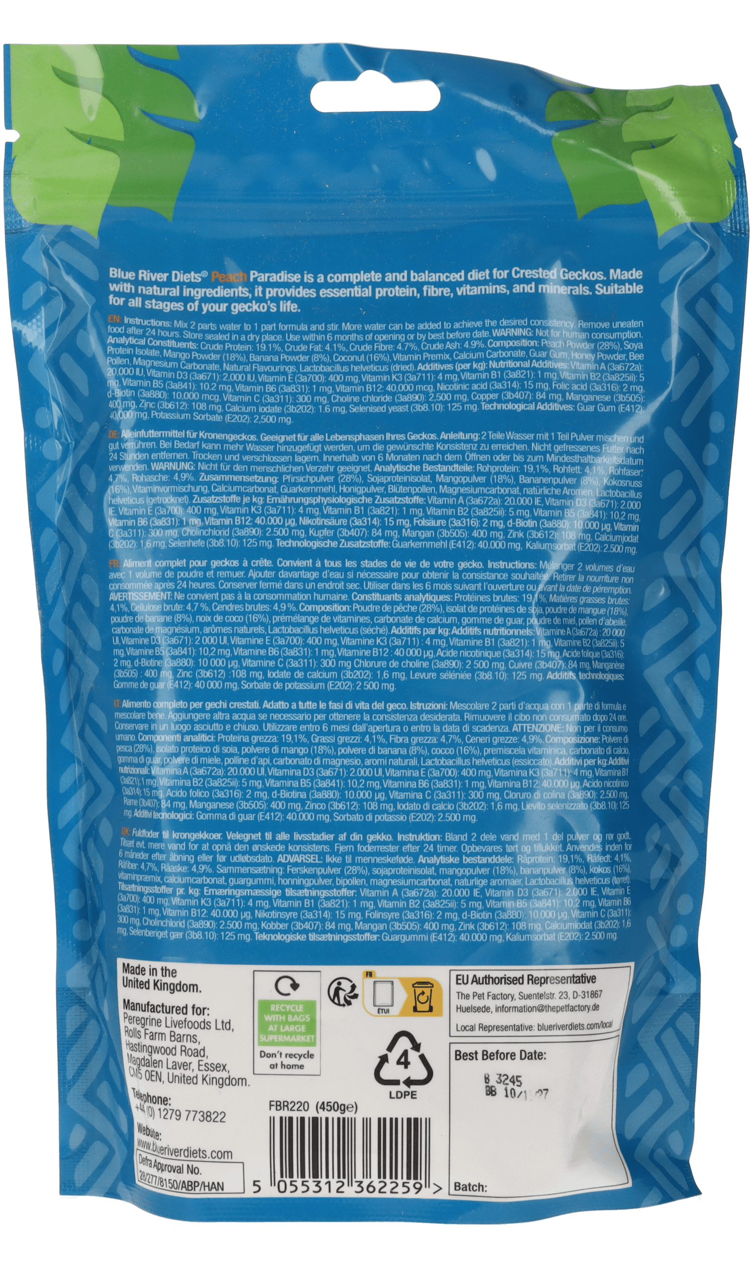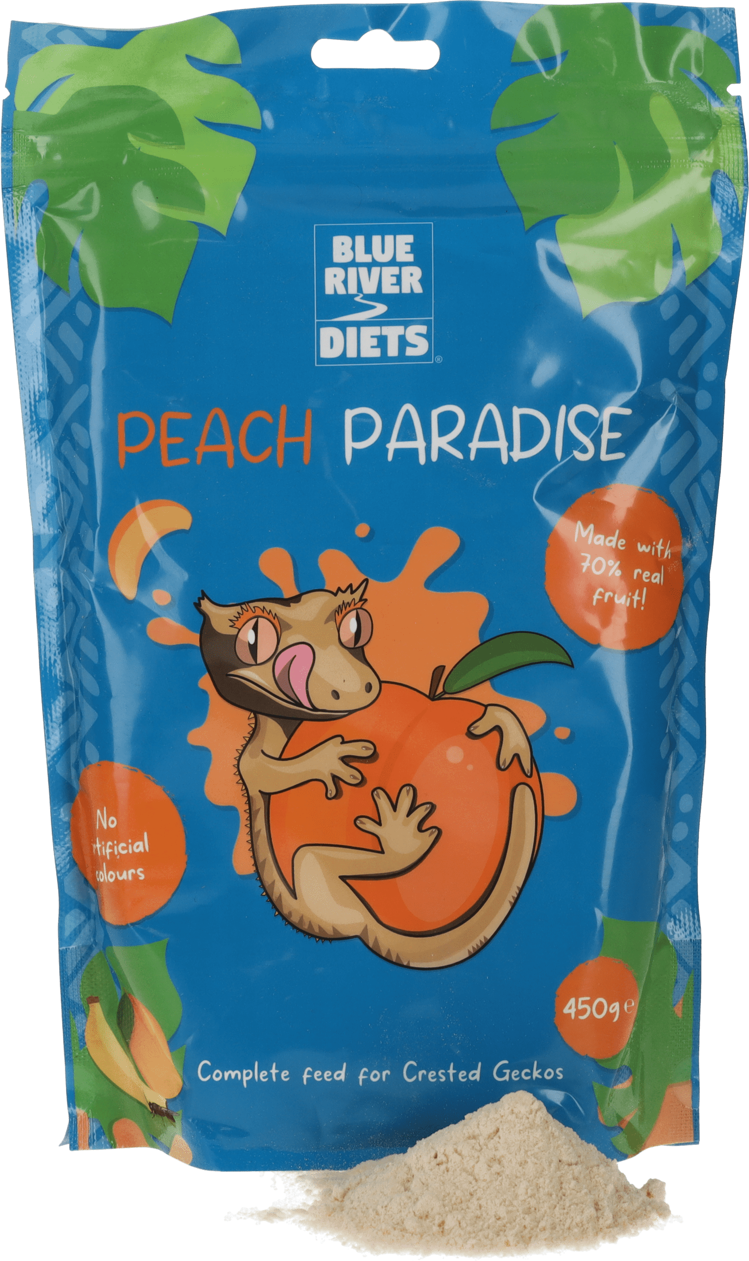 Peach Paradise delivers a mellow, smooth fruit profile with 70% peach enhanced by mango, banana and coconut. Naturally sweet but not overpowering, it is ideal for geckos that prefer a softer, gentler flavour. Nutritionally complete with honey, bee pollen, probiotics and balanced proteins.