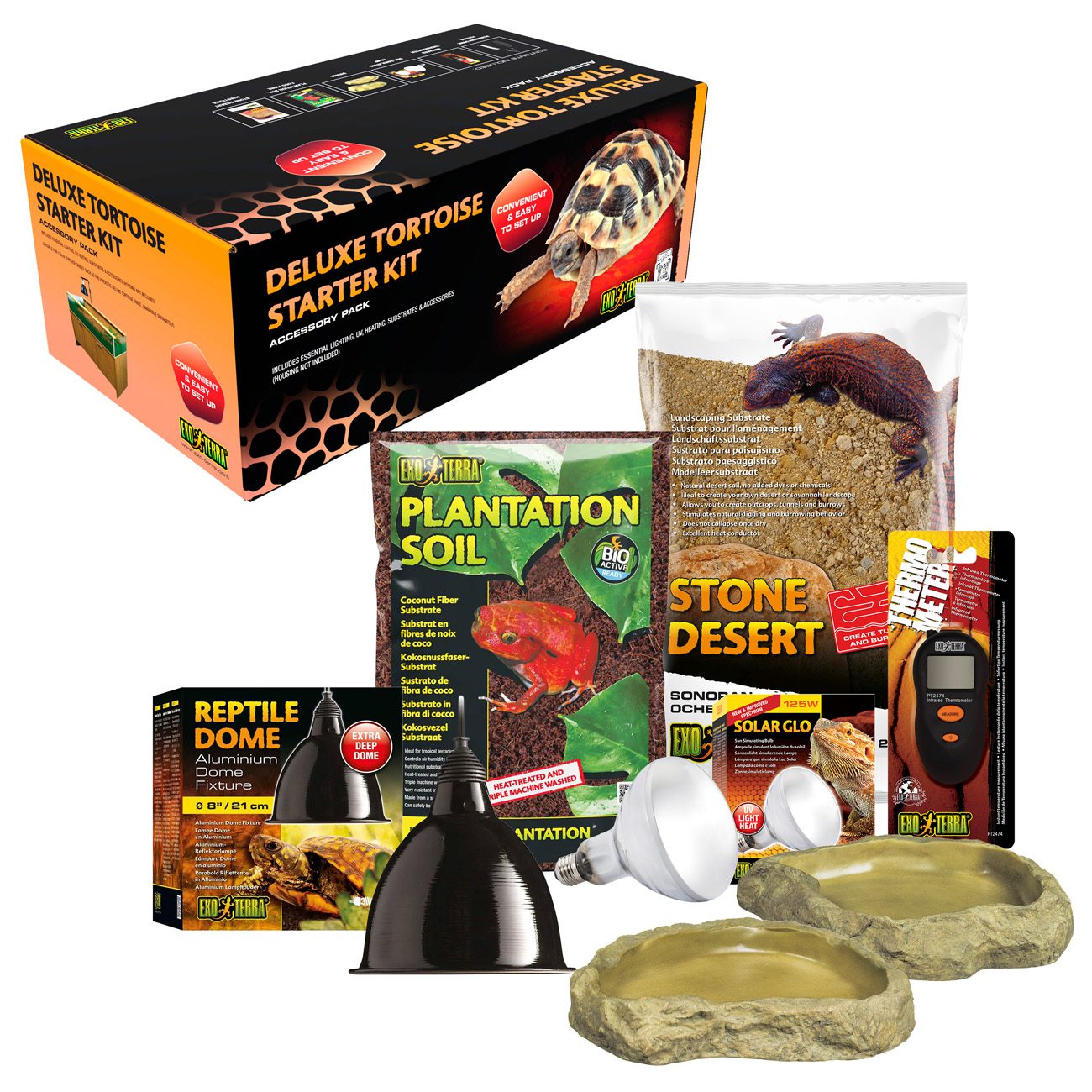 The kit contains the following items: Exo Terra Reptile Dome, Exo Terra Solar Glo Sun Stimulating Lamp (125W), Exo Terra Infrared Thermometer, Exo Terra Plantation Soil, Exo Terra Stone Desert (Sonoran Ocher), 2x Exo Terra Water Dishes. Recommended for use with 120cm tortoise tables such as the Vivexotic Deluxe Tortoise Table (not included).