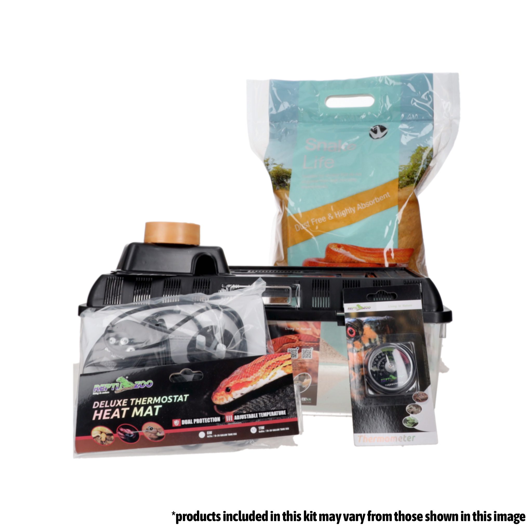 Complete starter kit with everything you need to house a hatchling snake, including terrarium, thermostat, heat mat, thermometer, water dish, hide, and substrate.