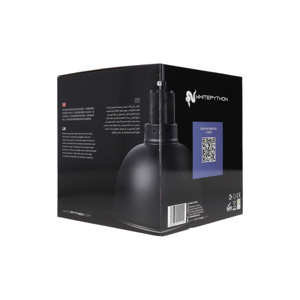 WhitePython Night Forge Heat Lamp Reflector Dome 20×20–24cm combines modern design with high-quality heat management. Featuring a sleek black knurled lamp holder, matte black dome and polished aluminium interior, it offers dependable heat and light projection with a clean, contemporary look. Suitable for heat lamps up to 150w, it brings both functionality and refined style to reptile enclosures.